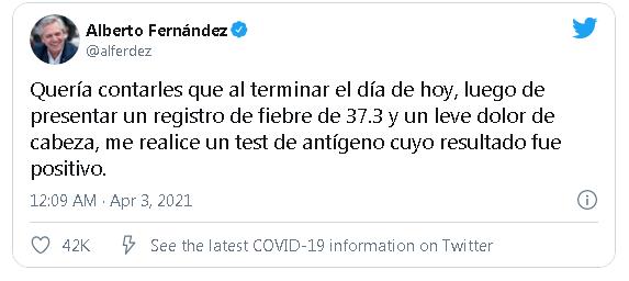 El presidente Alberto Fernández anunció hoy que dio positivo de coronavirus en un test de antígeno y que se encuentra aislado por indicación de su médico, en su cuenta de Twitter, el presidente dijo que se encuentra “físicamente bien” y que se sometió al testeo tras presentar un registro de 37.3 grados de fiebre y un dolor de cabeza.
