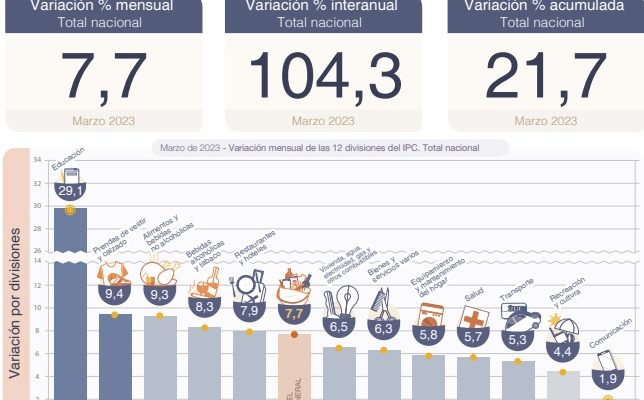 Así, el Índice de precios al consumidor acumuló en el primer trimestre del año un incremento de 21,7%, mientras que en los últimos 12 meses, alcanzó el 104,3%, el nivel más alto desde septiembre de 1991.