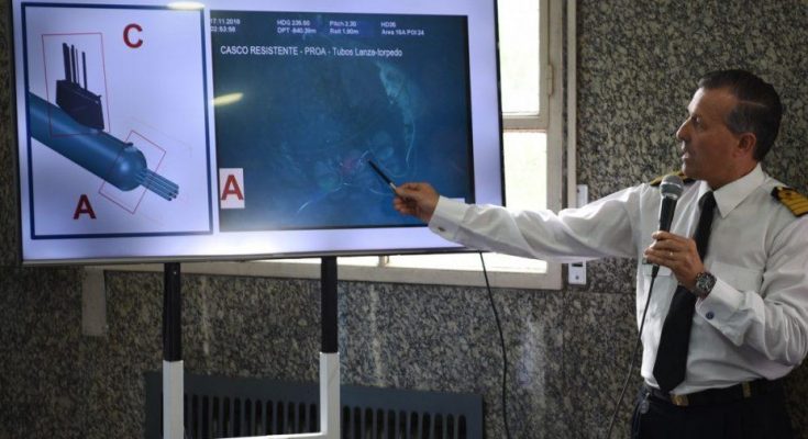 La topografía del fondo con desniveles es una de las dificultades señaladas por Dimier. Además, dice que se encuentra “sumamente averiado, sin reservas de flotabilidad y colapsado, muestra de la acción de explosiones internas y del efecto de la gran presión de esas profundidades”. “Todo hace pensar que su estructura está sumamente afectada, para lo cual los trabajos que se pudieren hacer para llevarlo a superficie podrían complicarse ante grandes posibilidades de que la nave se parta en el momento de intentar sacarla”, advierte Dimier.
