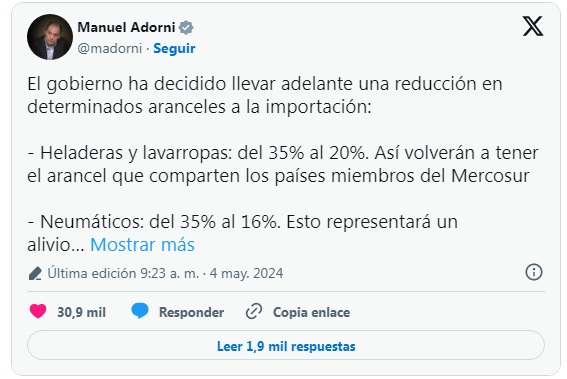 El gobierno de la Nación decidió apliar una reducción de aranceles a las importaciones de Heladeras, Lavarropas, Neumáticos e Insumos Plásticos, estas medidas fueron anunciadas por el vocero Manuel Adornis.