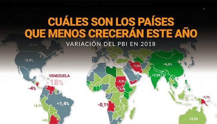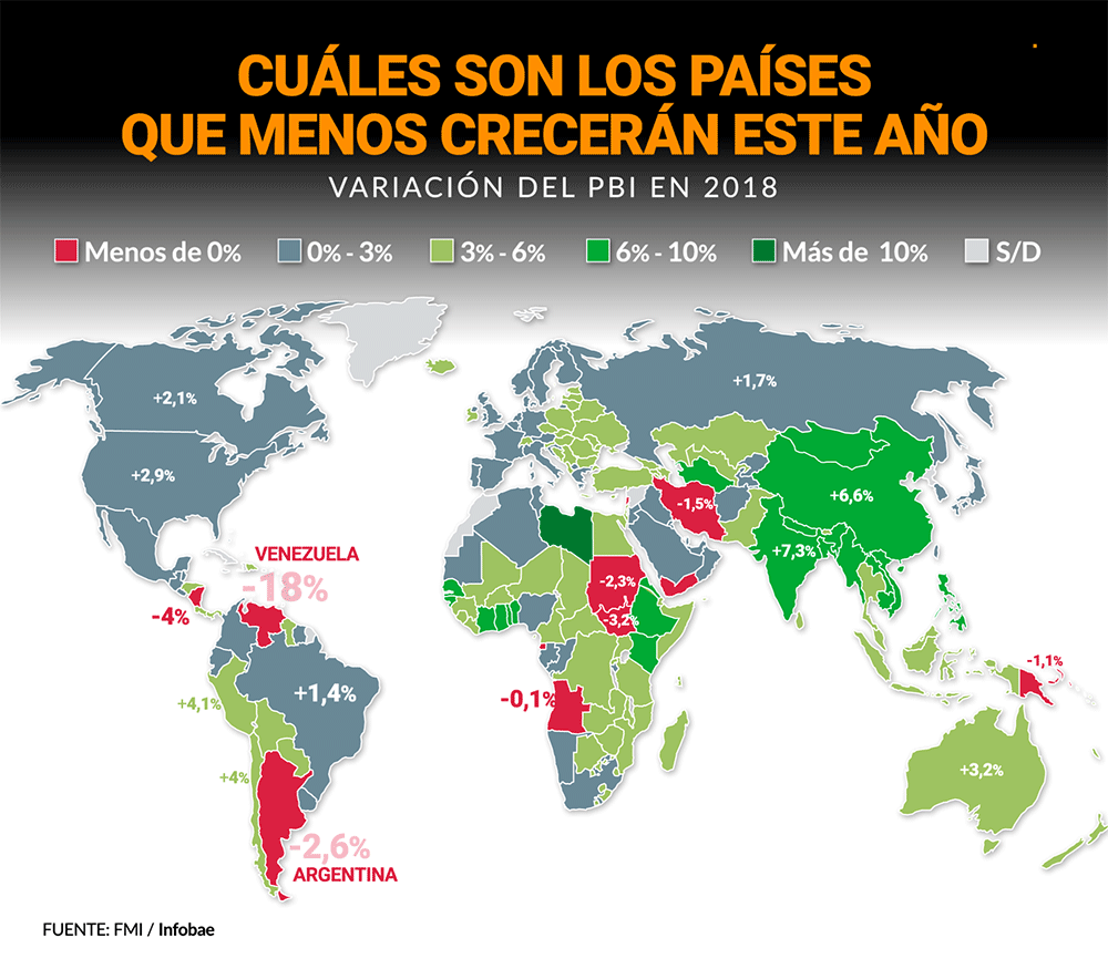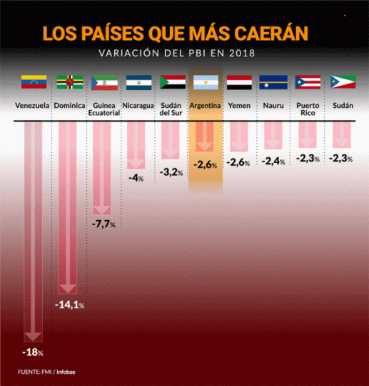 La Argentina tiene el triste honor de ocupar puestos de liderazgo en dos tablas en las que a ningún país le gustaría figurar: está quinto en 2018 entre las naciones de más inflación, pero además figura en los primeros puestos entre las economías que más caerán en 2018. Así lo señala Pablo Wende en una nota para el portal Infobae. Agrega que en la región, el derrumbe de 2,6% del PBI que estimó ayer el FMI sólo es superado por Venezuela, que sufrirá una contracción récord del 18%. Los otros países que figuran entre Venezuela y la Argentina son de bastante menor envergadura en el contexto global, tanto política como económica: Dominica, Guinea Ecuatorial, Nicaragua y Sudán del Sur.