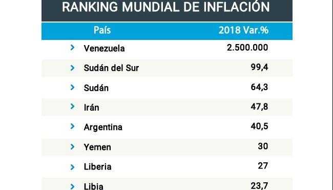 Sólo 17 países, sobre un total de unos 190, registran una inflación anual de dos dígitos. Primero indiscutido se encuentra Venezuela, en medio de una hiperinflación: el FMI calcula que la suba de precios alcanzará en 2018 a dos millones y medio por ciento.