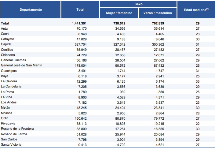 «En 2022 se evidencia una composición por sexo más feminizada y edad más envejecida, 22.186.791 son varones y 23.705.494 mujeres, la edad mediana es de 32 años. Se diferencian las regiones de: Gran Buenos Aires y Pampeana de 34 años; Patagonia y Cuyo 32; Noroeste 30 y Noreste 29.