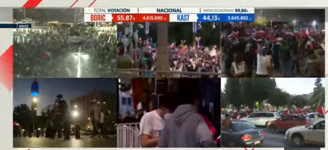 Con más del 99% de las mesas escrutadas, el candidato de la izquierda Gabriel Boric, obtiene un 55,81% de los votos y el conservador el 44,19%.