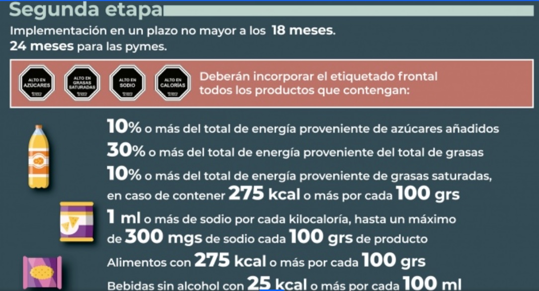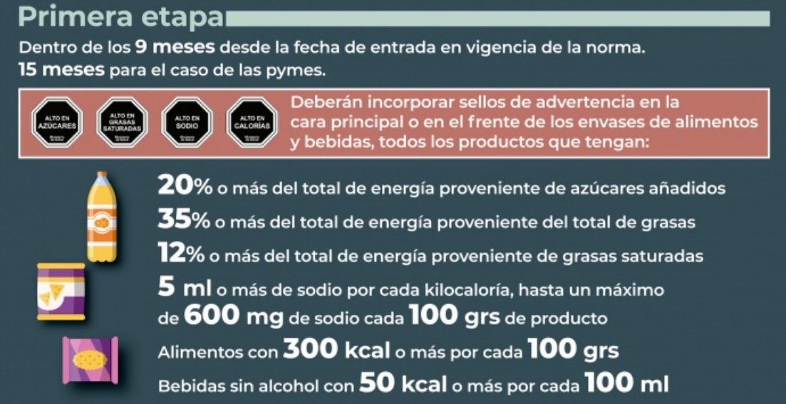 Los sellos establecidos por la ley se deberán colocar en el frente de los envases; se trata de octógonos negros que tendrán las siguientes inscripciones: “Exceso en azúcares”; “Exceso en sodio”; “Exceso en grasas saturadas”; “Exceso en grasas totales”; “Exceso en calorías”.