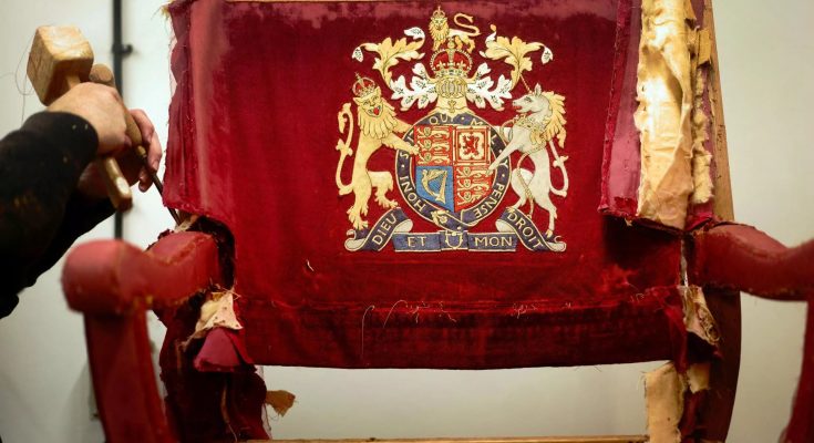 Un tapicero trabaja en la restauración de una silla del trono en Marlborough House, en esta silla, hecha en roble, se han coronado todos los monarcas desde 1308.