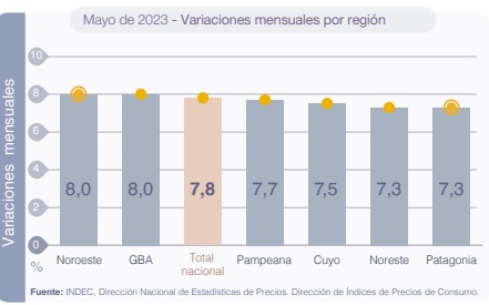 Las regiones del país que registraron las mayores subas fueron Noroeste y Gran Buenos Aires con un alza del 8%, seguida por la Pampeana (7,7%). Cuyo, que estuvo por debajo de la medición general, se ubicó en el 7,5%, tras él el Noreste con el 7,3% y por último la Patagonia con el 7,3%.