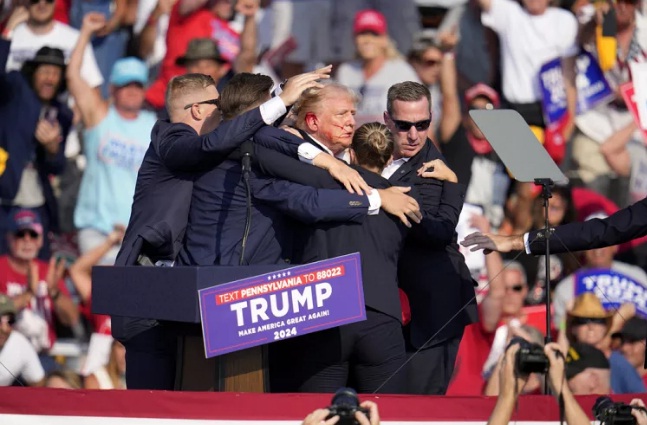 EE.UU. Donald Trump en un intento fallido de asesinato en un mitin en Pensilvania, un espectador muere, dos son heridos de gravedad y Trump herido también en la oreja derecha.