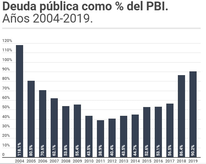 A marzo de este año ( 2020 ) la deuda pública total alcanza los US$ 323 mil millones, según los últimos datos del Ministerio de Economía, esta deuda representaba a fines de 2019 el 90,2% del Producto Bruto Interno (PBI) mucho más que su máximo valor alcanzado en el 2004 (llego al 90 %). De ese importe el 41% el Estado le debe a la agencias del Sector Público, como agencias provinciales o la ANSES, el 37% en manos de privados (como pueden ser empresas o fondos de inversión nacionales o extranjeros) y el 22% restante corresponde a organismos multilaterales y bilaterales (principalmente el Fondo Monetario Internacional -FMI- y al BID -Banco Interamericano de Desarrollo -).