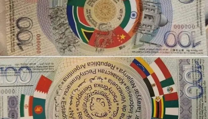Este hecho marca un hito significativo en los esfuerzos del bloque por establecer una alternativa al sistema financiero occidental y, en particular, al dólar estadounidense, el presidente ruso, Vladímir Putin, exhibió el modelo del billete BRICS, el cual incluye las banderas de los cinco miembros fundadores del bloque (Brasil, Rusia, India, China y Sudáfrica) dispuestas en un círculo, representando la unidad y cooperación entre estas economías emergentes. Además, en el reverso del billete aparecen otras banderas, entre ellas las de países que han mostrado interés en unirse al grupo, como México, Egipto, Nigeria y Bahréin, lo que evidencia la intención del bloque de expandir su influencia a nivel global.