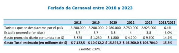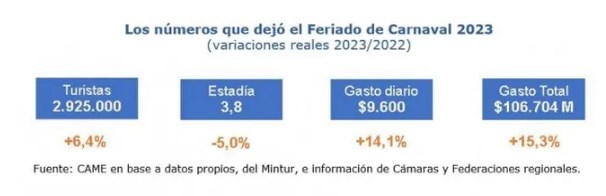 La Confederación Argentina de la Mediana Empresa (CAME) informo que viajaron 2.925.000 personas un 6,4% más de personas que en el Carnaval 2022, con un gasto total de $ 106.704 Millones en decir un crecimiento del 15,3%, a pesar de la hola gélida que vivió nuestro país.