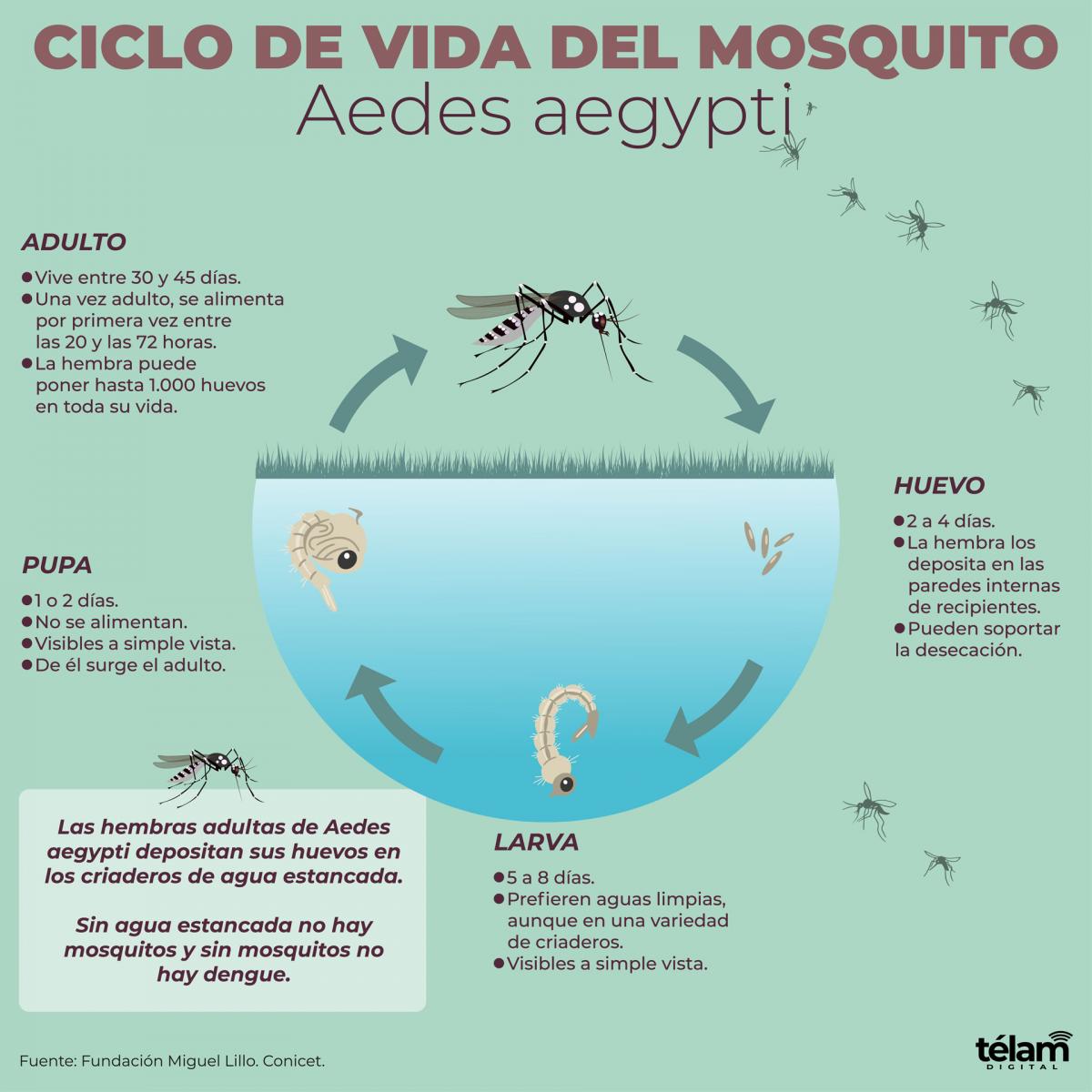 Salud señaló que el Aedes aegypti tiene hábitos domiciliarios y se reproduce en cualquier recipiente natural o artificial que contenga agua. Sus huevos pueden resistir las condiciones ambientales secas durante más de un año, siendo ésta una de las estrategias más importantes que la especie emplea para sobrevivir y propagarse.