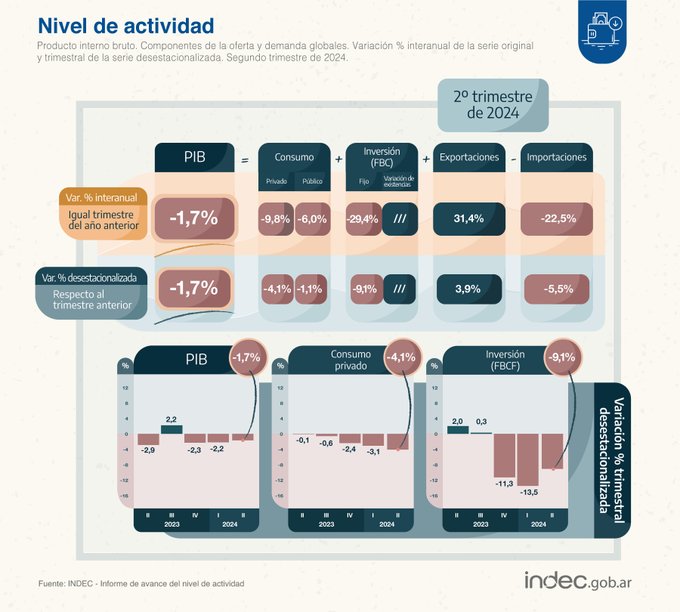 De acuerdo con los datos del Instituto Nacional de Estadística y Censos (INDEC), en el segundo trimestre de 2024 la actividad económica cayó 1,7% y acumula ya un 3,4% en los primeros seis meses.