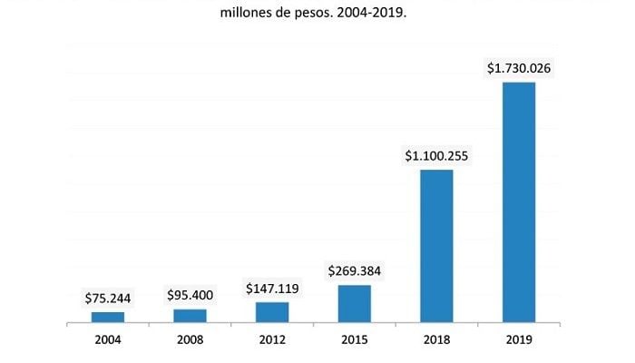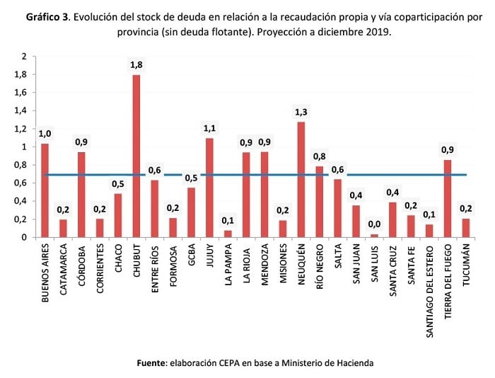 No obstante, como reflejo de la política de financiamiento de la administración nacional, “a partir de 2016 se percibe un cambio en el sentido de la curva. La estimación de deuda a finales de 2019 ascendería a $1.730.026 millones y la recaudación propia de las 24 provincias sumaría $961.418 millones, mientras que la coparticipación ascendería a $1.540.976 millones. En definitiva, la deuda pesará 0,69 de la recaudación anual, casi duplicando su incidencia respecto de 2015”.