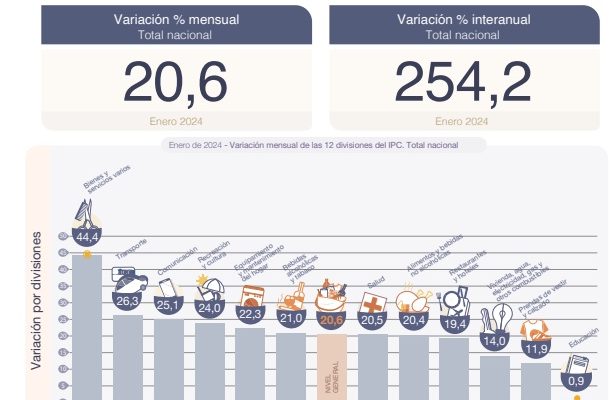 La inflación de enero fue 20,6% según el Índice de Precios al Consumidor (IPC), informe del Instituto Nacional de Estadística y Censos (INDEC). La inflación interanual fue de 254,2%.
