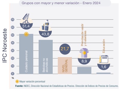 En la comparación regional, la Patagonia fue la que se ubicó al tope: 24,2% de inflación en enero. Le siguieron Cuyo (22,3%), Noroeste (21,7%), Región Pampeana (21,2%), Gran Buenos Aires (19,6%) y Noreste (19,5%).