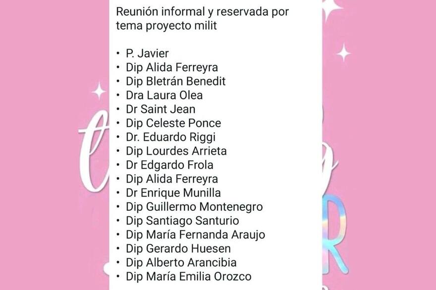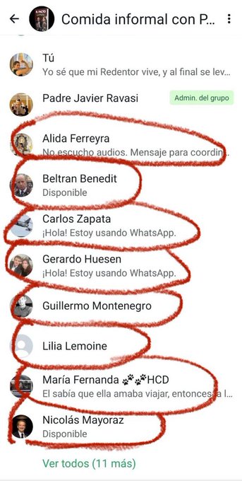 Del grupo de Whas…según las capturas, figuraban los siguientes diputados nacionales de LLA: Alida Ferreyra, Beltrán Benedit, María Celeste Ponce, Carlos Zapata, Nicolas Fernando Mayoraz, Lilia Lemoine, Gerardo Huesen, Guillermo Montenegro, María Fernanda Araujo, Emilia Orozco, Santiago Santurio y Alberto Arancibia, también abogados, jueces y exfuncionarios: María Laura Olea, Ricardo Saint Jean, Edgardo Riggi, Edgardo Frola y Enrique Munilla.