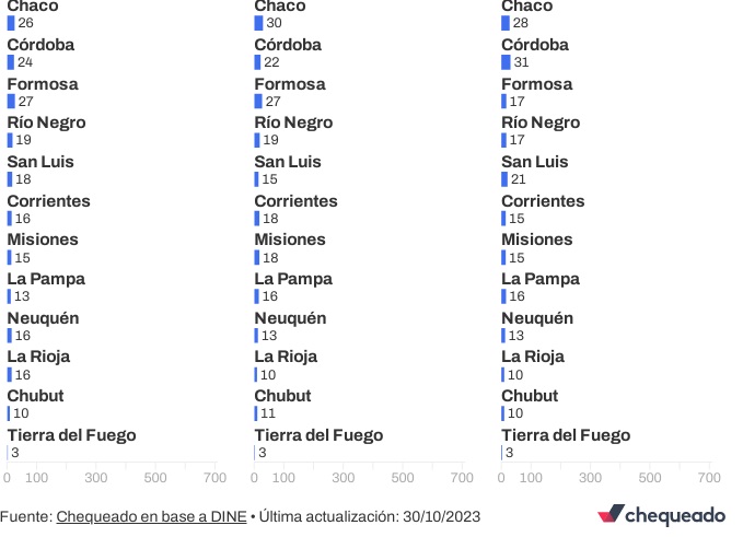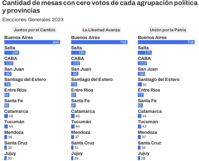 La provincia con el mayor registro de mesas que tienen al menos una fuerza sin votos es Buenos Aires: allí Unión por la Patria tuvo 708 mesas sin votos, La Libertad Avanza, 702 y Juntos por el Cambio, 695.