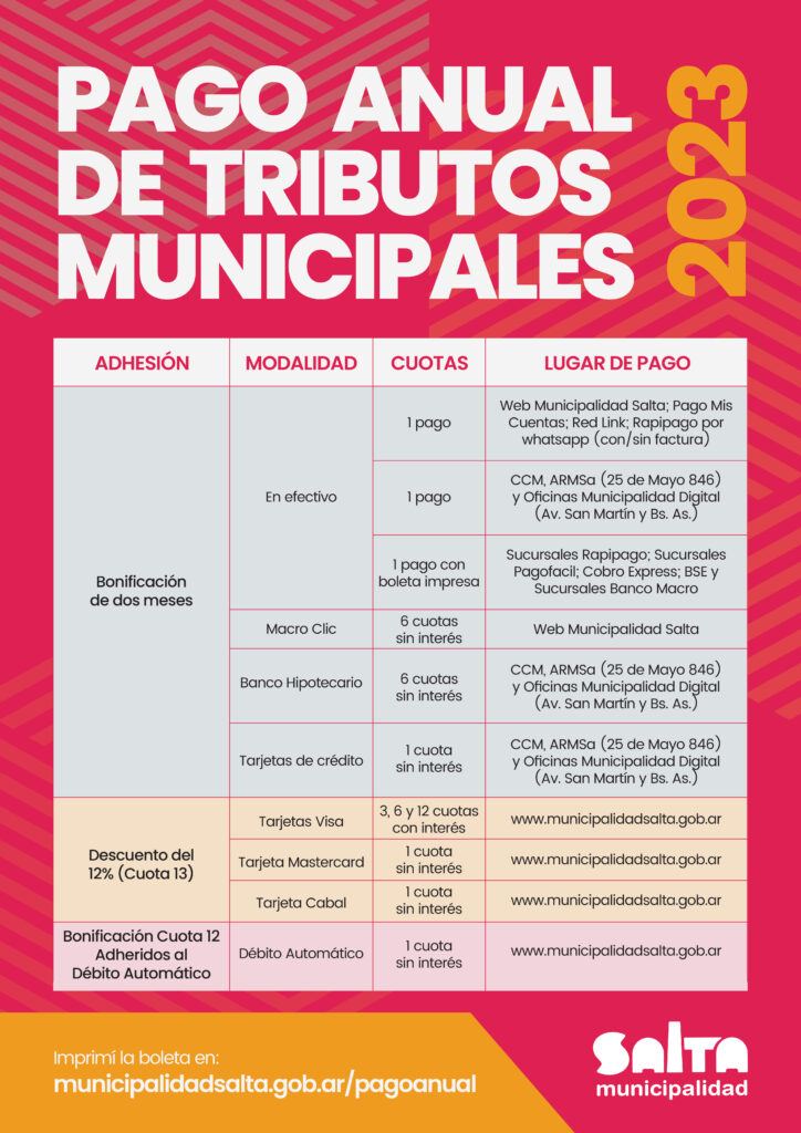 Se bonifican noviembre y diciembre; es decir que el contribuyente abona solo 10 períodos de facturación. Se puede abonar al contado o de forma on line https://municipalidadsalta.gob.ar/  Para esta última opción está disponible Macro Clic en 6 cuotas sin interés.