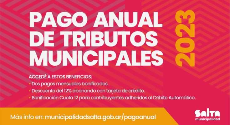 El descuento se realiza sobre el monto total a pagar en doce meses. Se puede abonar con Tarjetas Visa, Mastercard y Cabal, en 3, 6 y 12 cuotas. Para el descuento del 12%, todas las operaciones deben realizarse vía on line https://municipalidadsalta.gob.ar/