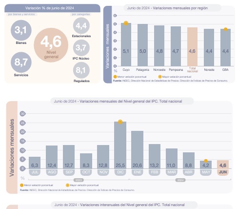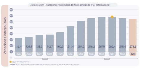 El Instituto Nacional de Estadística y Censos (Indec) informó que el Índice de Precios al Consumidor (IPC) registró un 4,6% en junio. En el primer semestre, acumuló un alza de 79,8% y a nivel interanual la suba alcanzó el 271,6%.