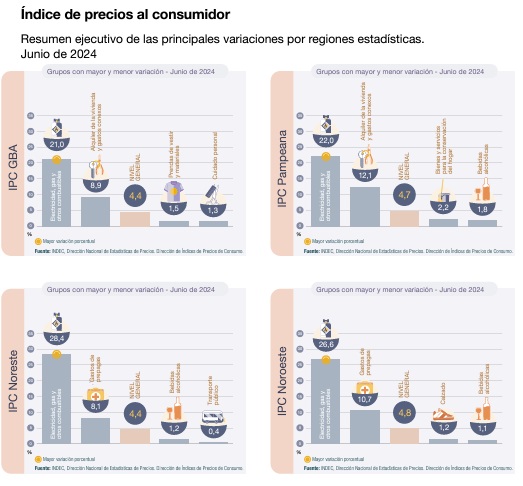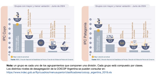 Por su parte, las dos divisiones que registraron las menores variaciones en junio fueron “Bebidas alcohólicas y tabaco” (2,1%) y “Equipamiento y mantenimiento del hogar” (2,3%).