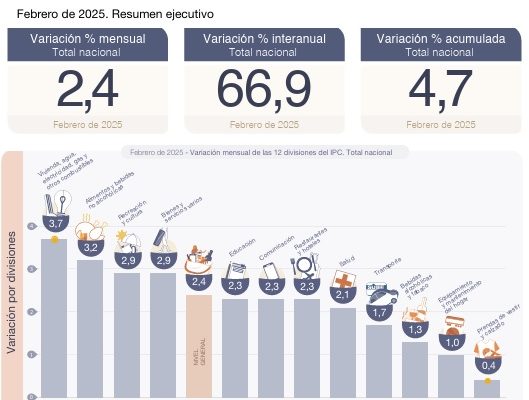 Las dos divisiones que registraron las menores variaciones en febrero de 2025 fueron Equipamiento y mantenimiento del hogar (1,0%) y Prendas de vestir y calzado (0,4%).