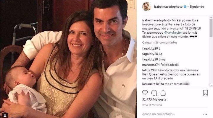 La actriz ISABEL MACEDO se comunica permanentemente por Instagram. Y esta vez no fue diferente, pero por un motivo muy especial: publicó este mediodía una fotografía familiar con su esposo, el gobernador JUAN MANUEL URTUBEY, y su primogénita, Belita, para celebrar los dos años de matrimonio. Una frase de mujer enamorada corona la imagen.