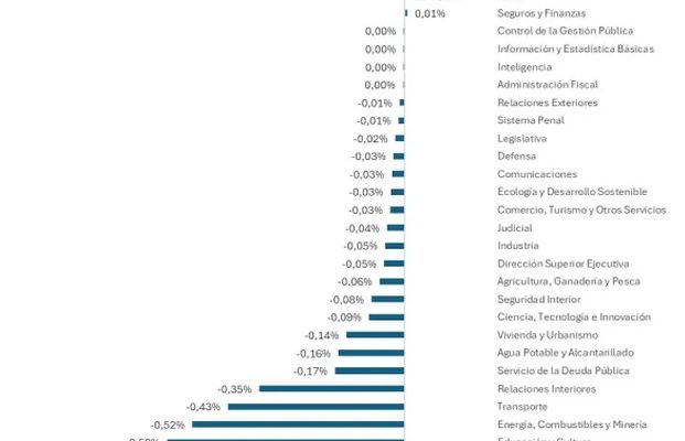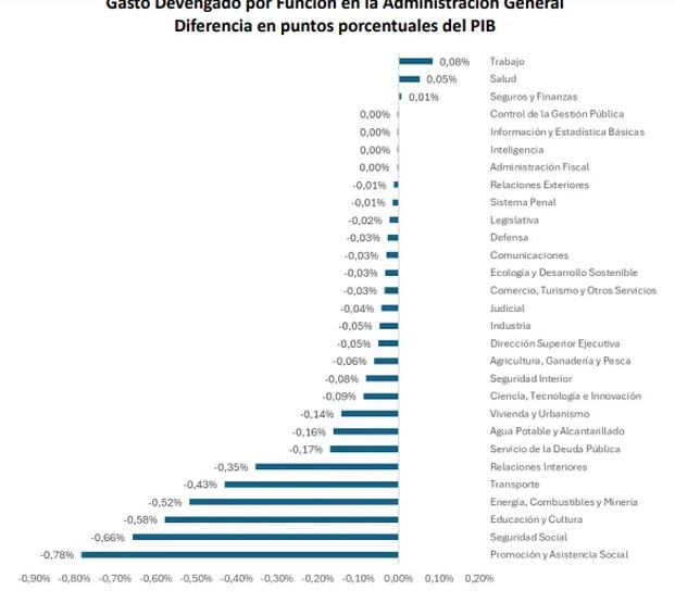 Las que subieron su participación fueron Trabajo, con 0,08 puntos del PBI; salud, 0,05 y finanzas e intereses con el 0,01 punto de incremento.