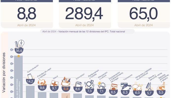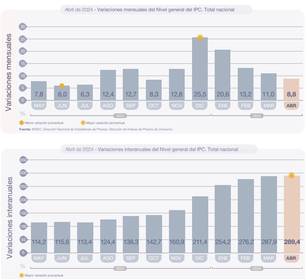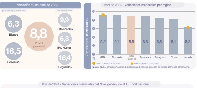 El Índice de Precios al Consumidor (IPC) registró un 8,8% respecto de marzo, acumula un incremento del 65% en el primer cuatrimestre del corriente año y del 289,4% en comparación con igual mes del 2023.
