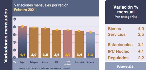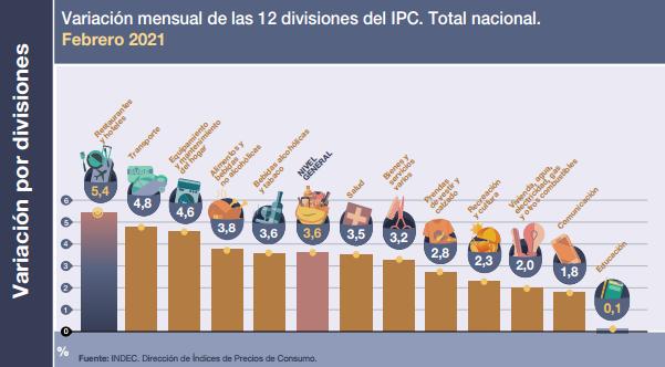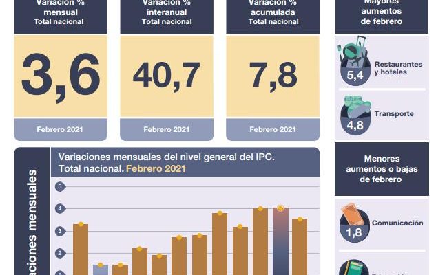 El Índice de Precios al Consumidor (IPC) aumentó 3,6% durante febrero, informó el Instituto Nacional de Estadística y Censos (Indec). De esta forma, el nivel general del Índice de precios al consumidor acumuló un alza de 7,8% en los dos primeros meses del año.