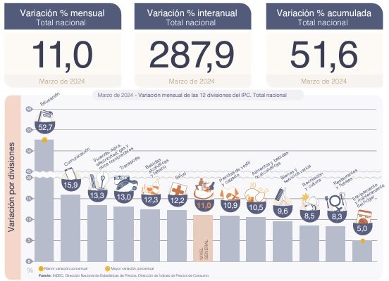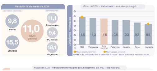 El INDEC dio a conocer el IPC correspondiente al mes de marzo de 2024, que alcanzó 11,1%. La inflación interanual, que sumó 287,9%.