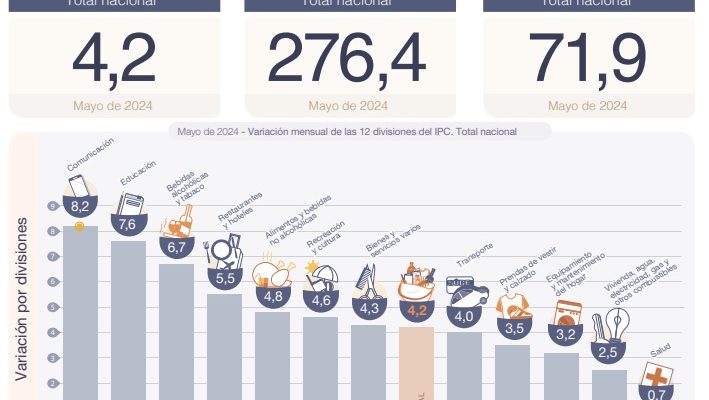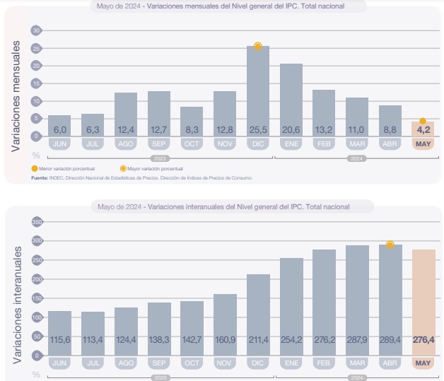 La inflación de mayo fue del 4,2%, en lo que va del año acumula un alza del 71,9% y la interanual se ubicó en el 276,4%, según informó esta jornada el INDEC.