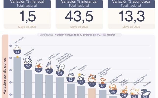 Los segmentos que más crecieron  en el mes fue Comunicación (4,1%), por subas en Servicios de telefonía e internet, le siguió Restaurantes y hoteles (3%), por las alzas en restaurantes y comidas fuera del hogar., en el otro extremo, las dos divisiones que registraron las menores variaciones en mayo de 2025 con respecto al mes previo fueron Alimentos y bebidas no alcohólicas (0,5%) y Transporte (0,4%).
