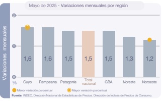 Los segmentos que más crecieron  en el mes fue Comunicación (4,1%), por subas en Servicios de telefonía e internet, le siguió Restaurantes y hoteles (3%), por las alzas en restaurantes y comidas fuera del hogar., en el otro extremo, las dos divisiones que registraron las menores variaciones en mayo de 2025 con respecto al mes previo fueron Alimentos y bebidas no alcohólicas (0,5%) y Transporte (0,4%).