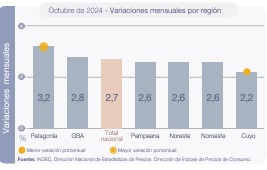 A nivel regional, la inflación estuvo entre 2,2% en Cuyo y 3,2% en la Patagonia, mientras que en varias regiones fue de 2,6%. En el GBA la inflación fue de 2,8%. En cuanto a la moderación en alimentos y bebidas no alcohólicas, desde C&T Asociados resaltaron que en Cuyo hubo una baja de 0,4% en el mes, mientras que en el GBA, un alza del 1,2%. “Esto se dio pese a que las bebidas aumentaron 3,8%, y refleja la baja en verduras, pero también una muy moderada suba en carnes, mientras que lácteos, cereales y otros rubros aumentaron en torno a 2%”, explicaron.