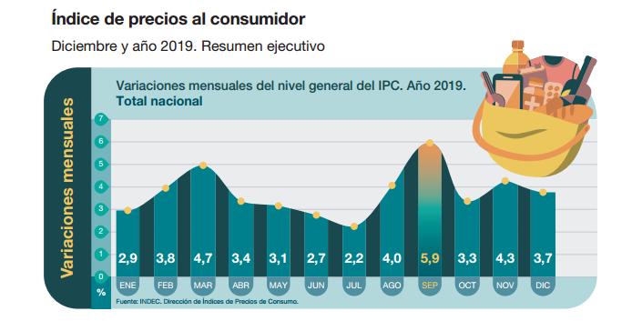 La inflación de precios trepó a 3,7% en diciembre y alcanzó a 56,7% en todo el 2019. Los rubros que registraron mayores subas a lo largo de 2019 fueron Salud, con un alza de 72,1%; Comunicación avanzó 63,9%, mientras que Equipamiento y mantenimiento del hogar -rubro muy influenciado por el dólar- mostró un alza de 63,7%., alimentos y bebidas tuvo un aumento de 56,8% en todo 2019. En diciembre, los mayores incrementos se vieron en: Comunicación (9,6%), Salud (5,6%) y en Equipamiento y mantenimiento del hogar (5,4%). Los Alimentos y Bebidas avanzaron 3,1%.