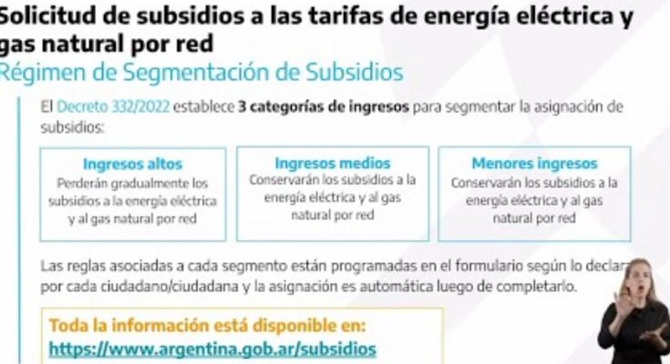 El decreto 332/2022 estableció “un régimen de segmentación de subsidios a usuarios y usuarias residenciales de los servicios públicos de energía eléctrica y gas natural por red, con el objeto de lograr valores de la energía razonables y susceptibles de ser aplicados con criterios de justicia y equidad distributiva”. Además determinó las características de los niveles de usuarios a los efectos de definir las características de la segmentación.