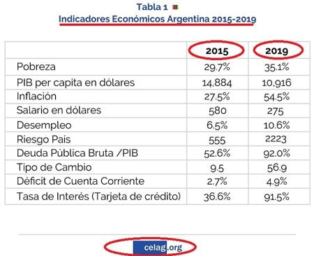 Sin embargo el Centro Estratégico Latinoamericano de Geopolítica (CELAG) recopiló algunos indicadores clave a la hora de evaluar una gestión de gobierno y comparó cómo estaban al final del gobierno de Cristina y como se encuentran, cuatro años más tarde, sobre el final del gobierno de Macri.