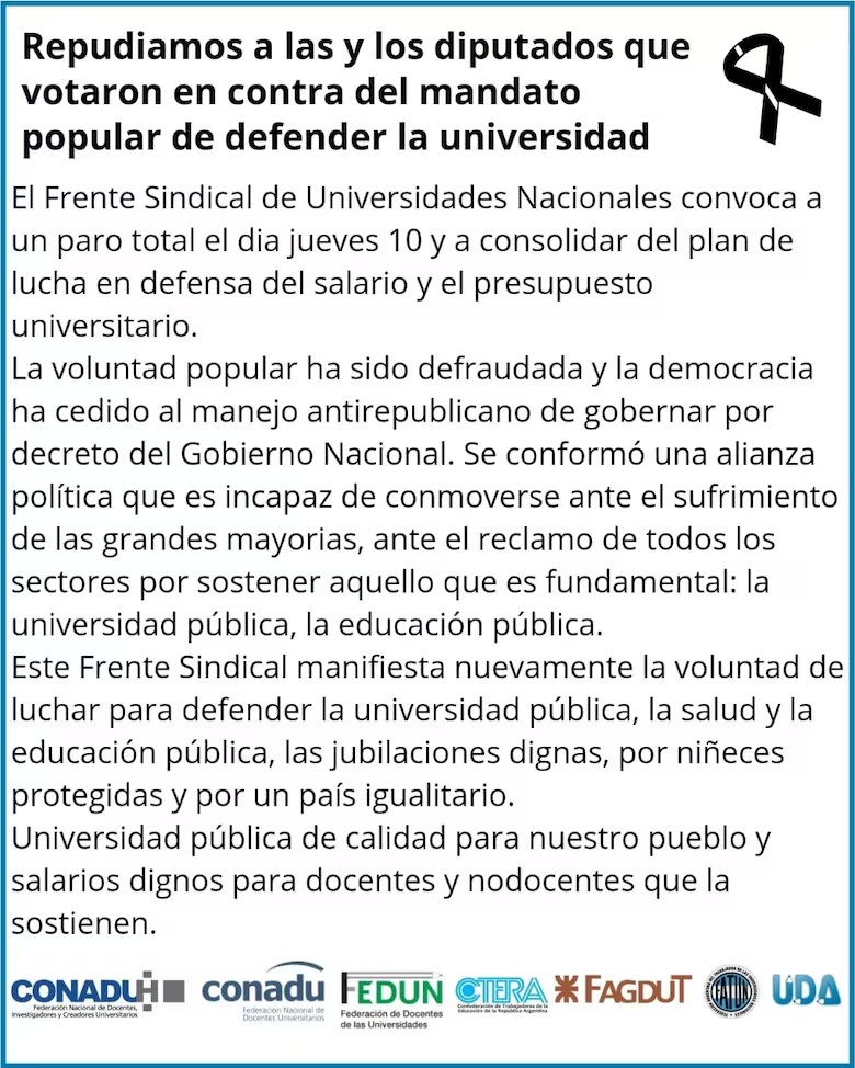 “Repudiamos a las y los diputados que votaron en contra del mandato popular de defender la universidad”, se titula el comunicado que firmaron Conadu, Conadu Histórica, Federación de Docentes de las Universidades (Fedun), Confederación de Trabajadores de la Educación (Ctera), Asociación Gremial de Docentes de la Universidad Tecnológica Nacional (Fagdut), Federación Argentina del Trabajador de Universidades Nacionales (Fatun) y Unión Docentes Argentinos (UDA).