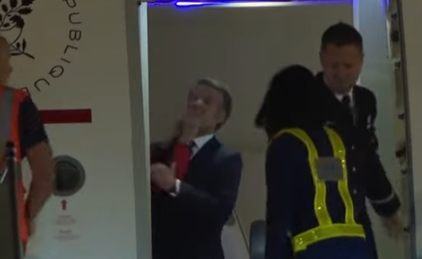 En ese momento, el presidente de Francia no se daba cuenta de que la puerta del aparato estaba abierta y podían captarlo los camarógrafos, comenta RFI, cuando de repente, se vieron los brazos empujándolo violentamente por el rostro. Macron pareció sorprenderse cuando giró rápidamente y saludó a los representantes de los medios con un gesto de la mano.