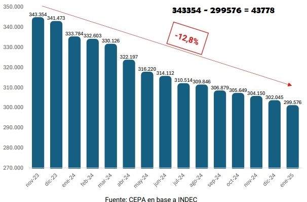 Entre noviembre de 2023 y enero de 2025, el personal se redujo en 43.778 trabajadores, lo que implica una caída del 12,8%.