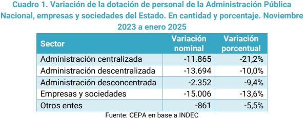 Entre noviembre de 2023 y enero de 2025, la dotación de personal se redujo en 43.778 puestos de trabajo, lo que implica una caída del 12,8%.