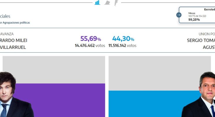 Javier Milei fue electo nuevo presidente de la Argentina tras superar al ministro de Economía y candidato de Unión por la Patria, Sergio Massa, en el balotaje realizado este domingo. El recuento provisional de votos, con un 99.28% de las mesas escrutadas, indica que el economista de La Libertad Avanza obtiene el 55,69% contra el 44,30% del oficialismo.