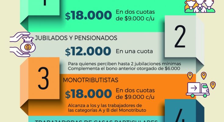 El Gobierno nacional anunció este lunes que otorgará bonos extraordinarios de $ 18.000 a trabajadores informales, monotributistas de categorías A y B y trabajadores de casas particulares de entre 18 y 65 años, y otra ayuda de $ 12.000 a jubilados y pensionados que perciban hasta dos haberes mínimos.