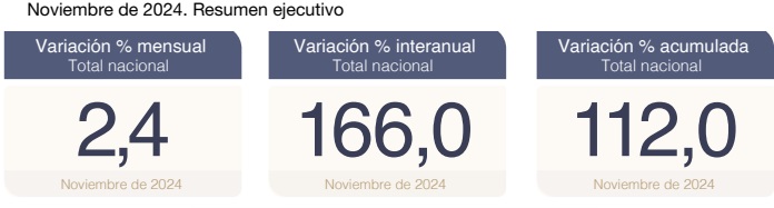 Las menores variaciones de noviembre se observaron en las divisiones equipamiento y mantenimiento del hogar (+1,5%) y alimentos y bebidas (+0,9%). A nivel de las categorías, regulados (+3,5%) lideró el incremento, seguidos por IPC núcleo (+2,7%), mientras que estacionales disminuyó 1,2%.