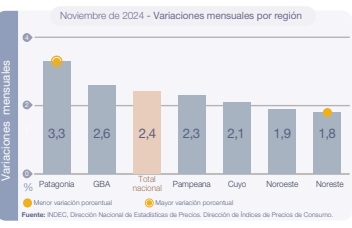 La Patagonia fue la región con la mayor suba mensual (+3,3%), seguida del Gran Buenos Aires (+2,6%) detras se ubicaron: Pampeana (+2,3%), Cuyo (+2,1%), Noroestre (+1,9%) y Noreste (+1,8%).