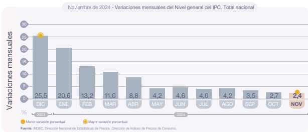 En el anteúltimo mes del año la inflación fue del 2,4%, cuando el mercado esperaba 2,8%. El ministro de Economía, Luis Caputo, desde su cuenta en X, hizo un posteo en alusión al dato de noviembre: “2,4% inflación minorista noviembre. La más baja desde julio 2020. Alimentos, 0,9%, Bienes,1,6%, Canasta básica alimentaria, 1,1%, Canasta básica total, 1,5%. El proceso de desinflación continúa. Cada vez más cerca de bajar el crawling peg al 1%”.