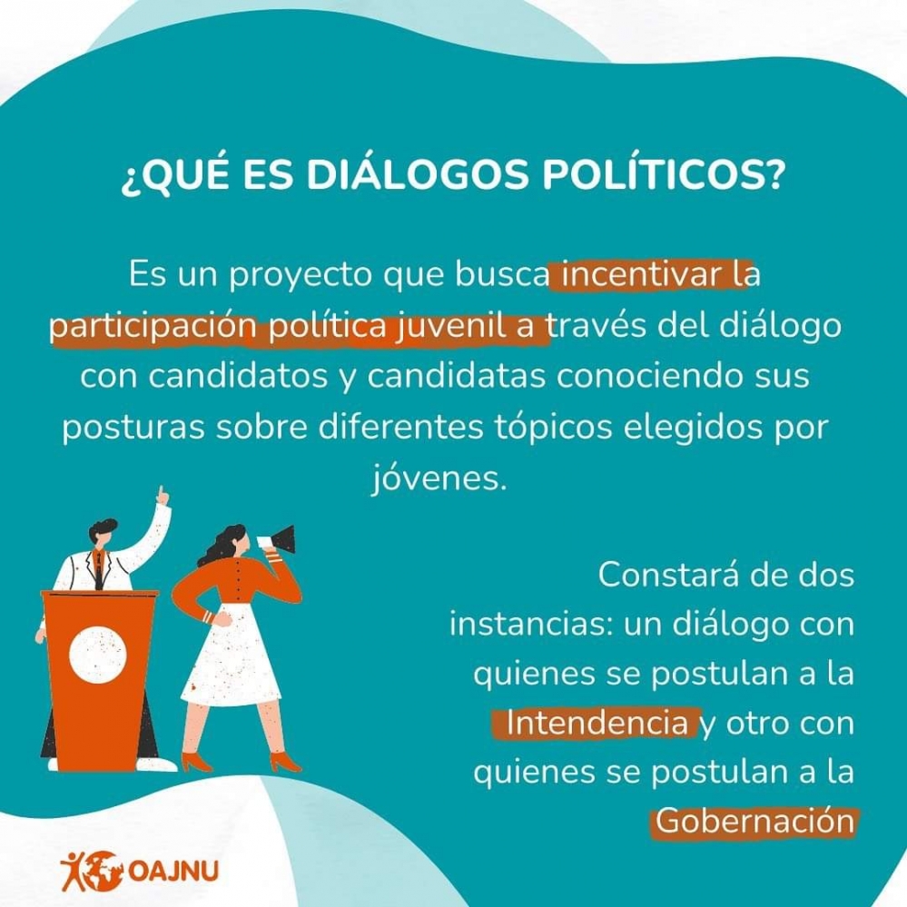 OAJNU organiza diálogos políticos con candidatos a gobernadores e intendentes de Salta, quienes expondrán sobre: violencia de género, acceso a la salud mental y centros de estudiantes, en la primera categoría y planificación urbana, discapacidad y acceso al primer empleo, para la segunda.