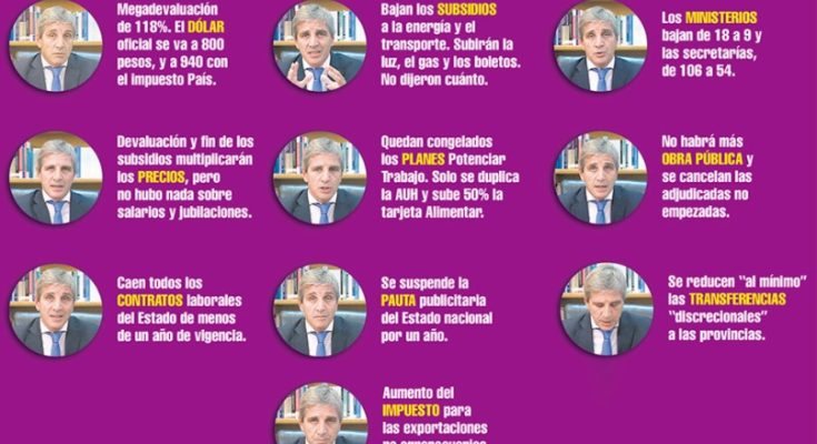 En un mensaje grabado, grabado y regrabado en donde le costó al gobierno encontrar el tono del discurso para anunciarte un super ajuste, tratando de explicarte con naranjas las medidas (aquí recuerdo al Chavo del 8 – nosotros lo sabiamos con manzanas-). En definitiva se trataba de un mensaje que le avisaba a la población que, durante varios meses, verá dispararse la inflación a un ritmo del 20 por ciento mensual y más, alimentada por un salto en el valor del dólar de más del 100 por ciento, que ya no habrá ningún tipo de control o sanciones a quienes aumenten precios de productos básicos de consumo injustificadamente, que las tarifas de servicios públicos y del transporte podrán elevarse al doble o más, y que en ese escenario de una previsible profunda recesión y caída en picada de la capacidad adquisitiva de los ingresos, no están previstas compensaciones para salarios y jubilaciones.